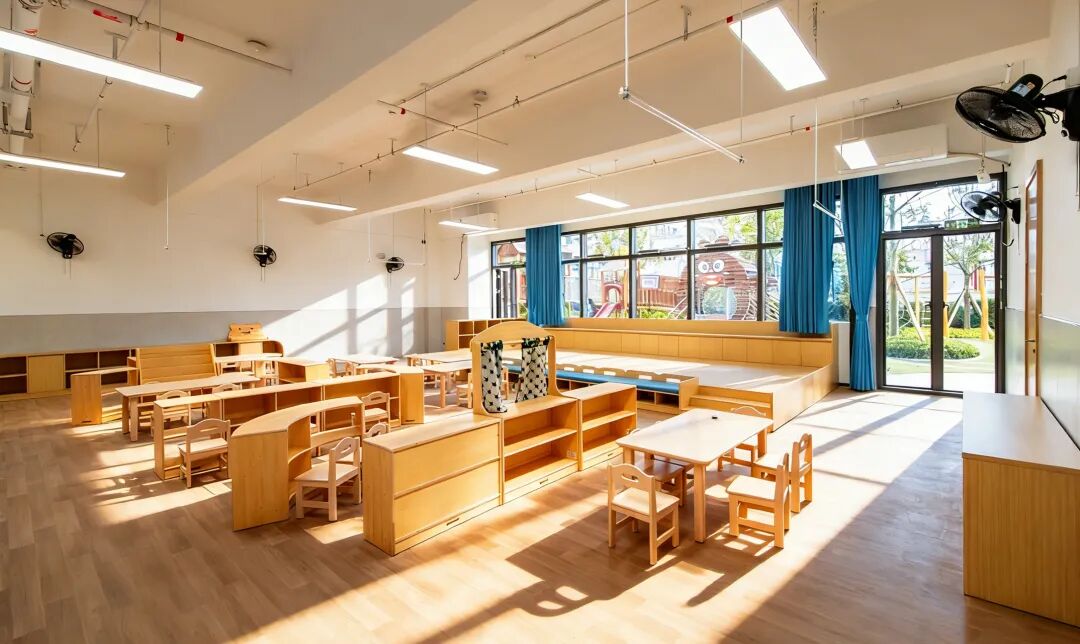 24班规模,约108㎡标准教室,每间容纳25-32位小朋友,还配备空调、风扇、紫外线消毒灯、希沃智能教学一体机等设施。