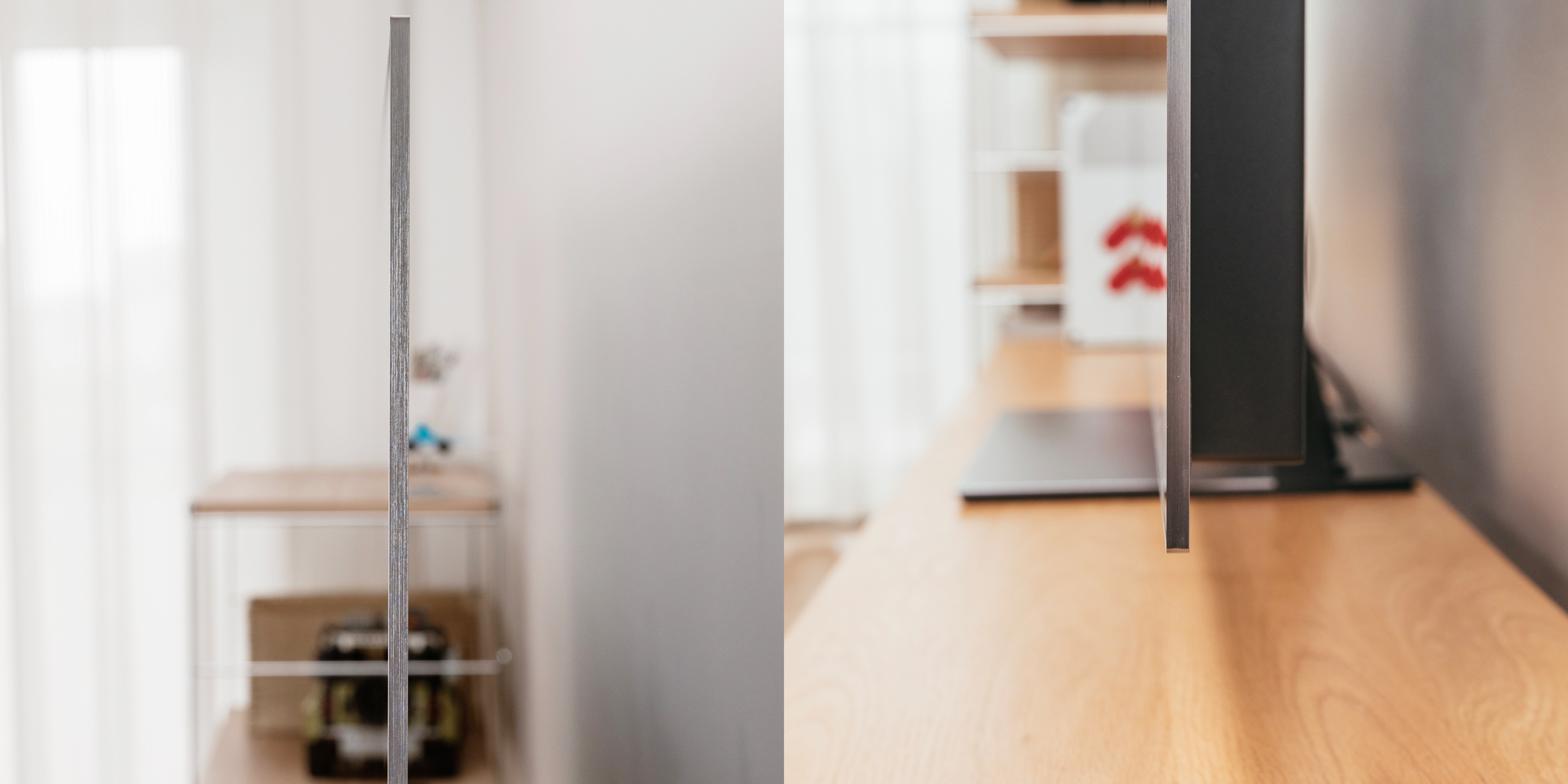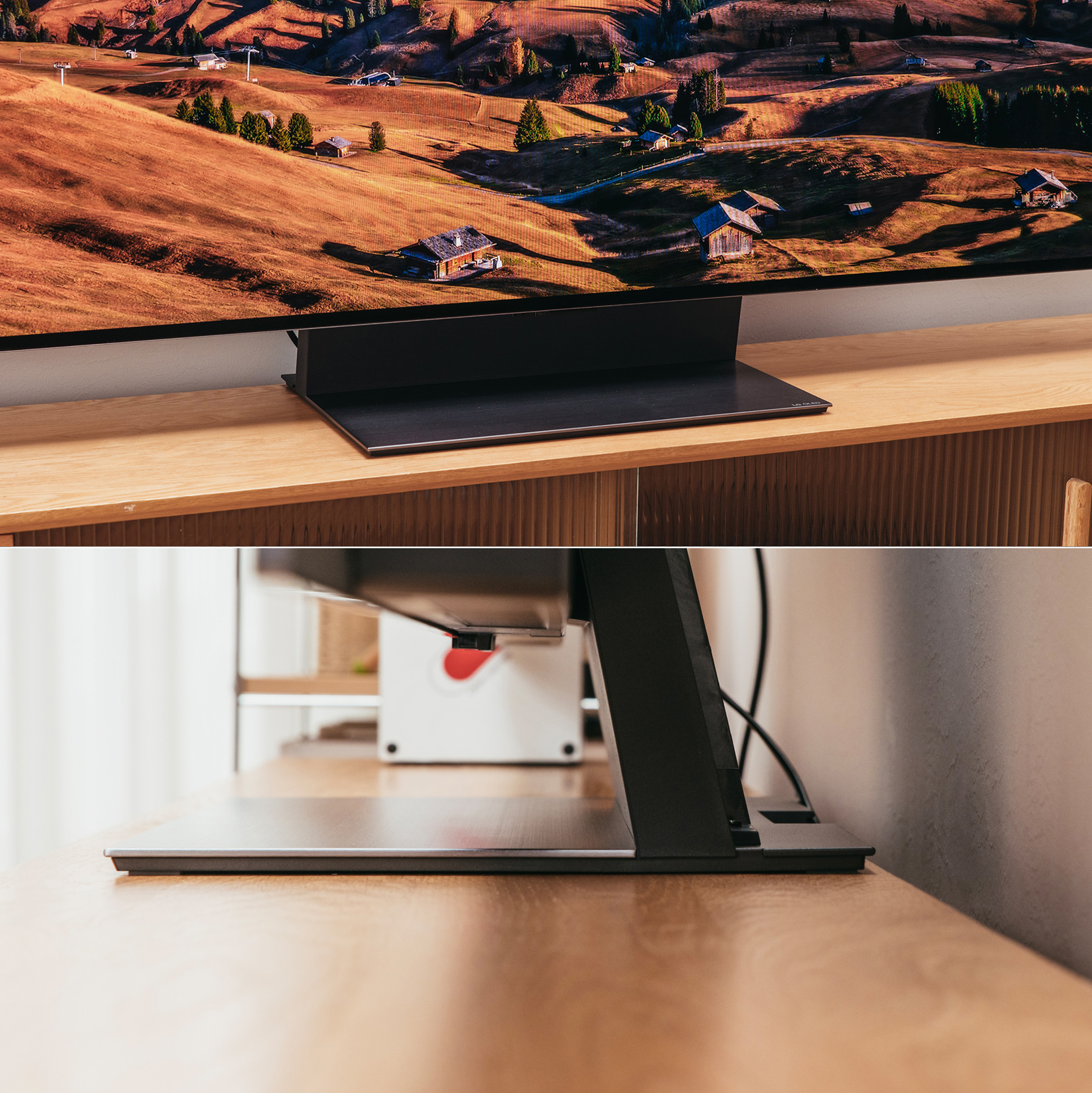 这个悬浮底座是我个人最喜欢的设计,底座本身有两档高度,图中的高度为最高位置,下调位置则可以达到更低调的显示效果。