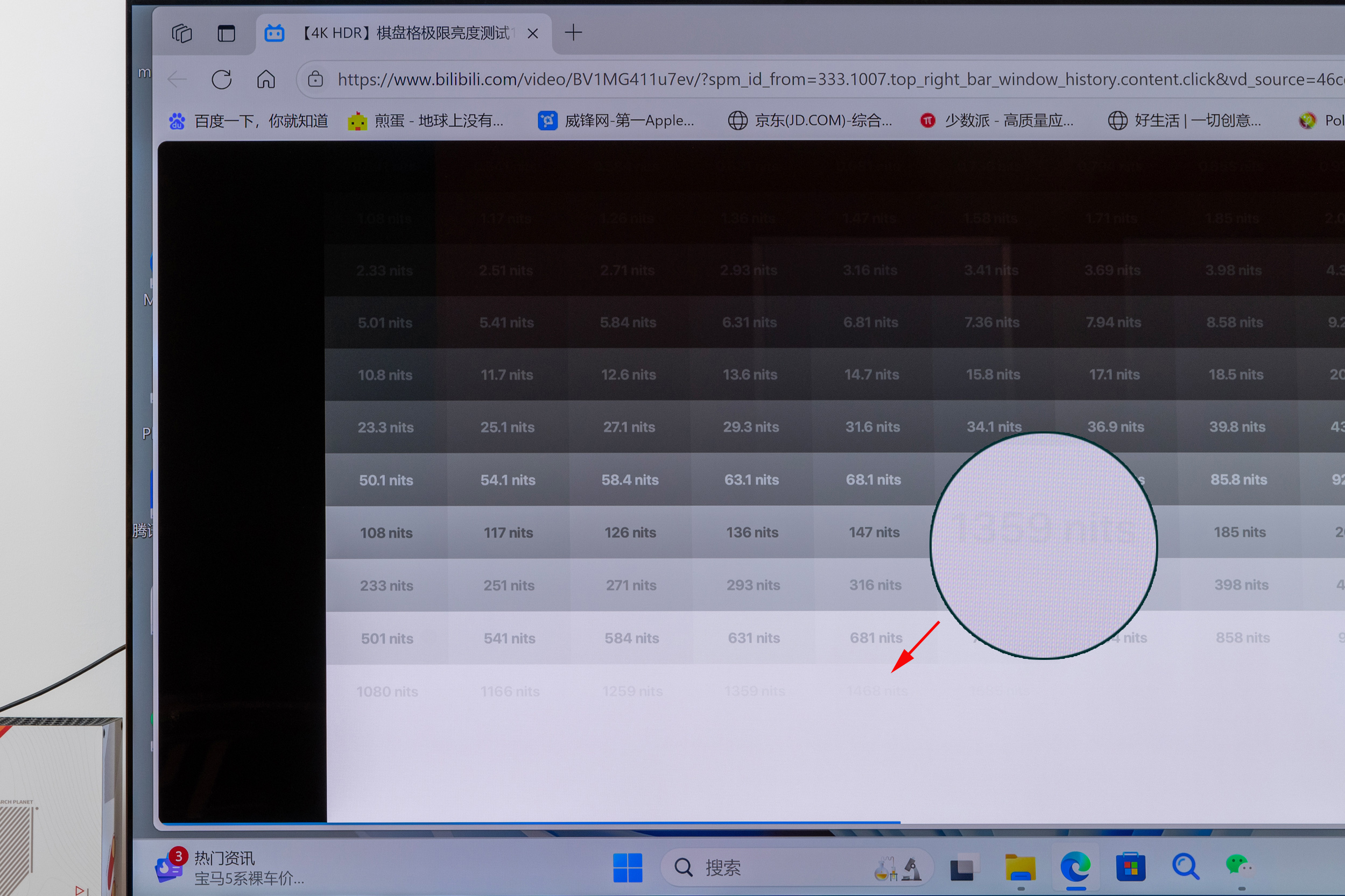 另一种测试方式,通过开启网站的HDR真彩画质,在HDR模式下打开峰值亮度测试视频,实测极限也差不多在1400nits左右。
