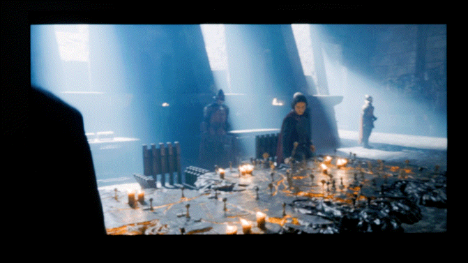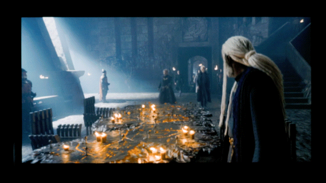 鸦栖堡之战后,无冕女王的丈夫科利斯·瓦列利安第一次继任国王之手,这段主要看光影和色彩,虽然光比比较大,但是依旧能看清不少墙面的细节。
