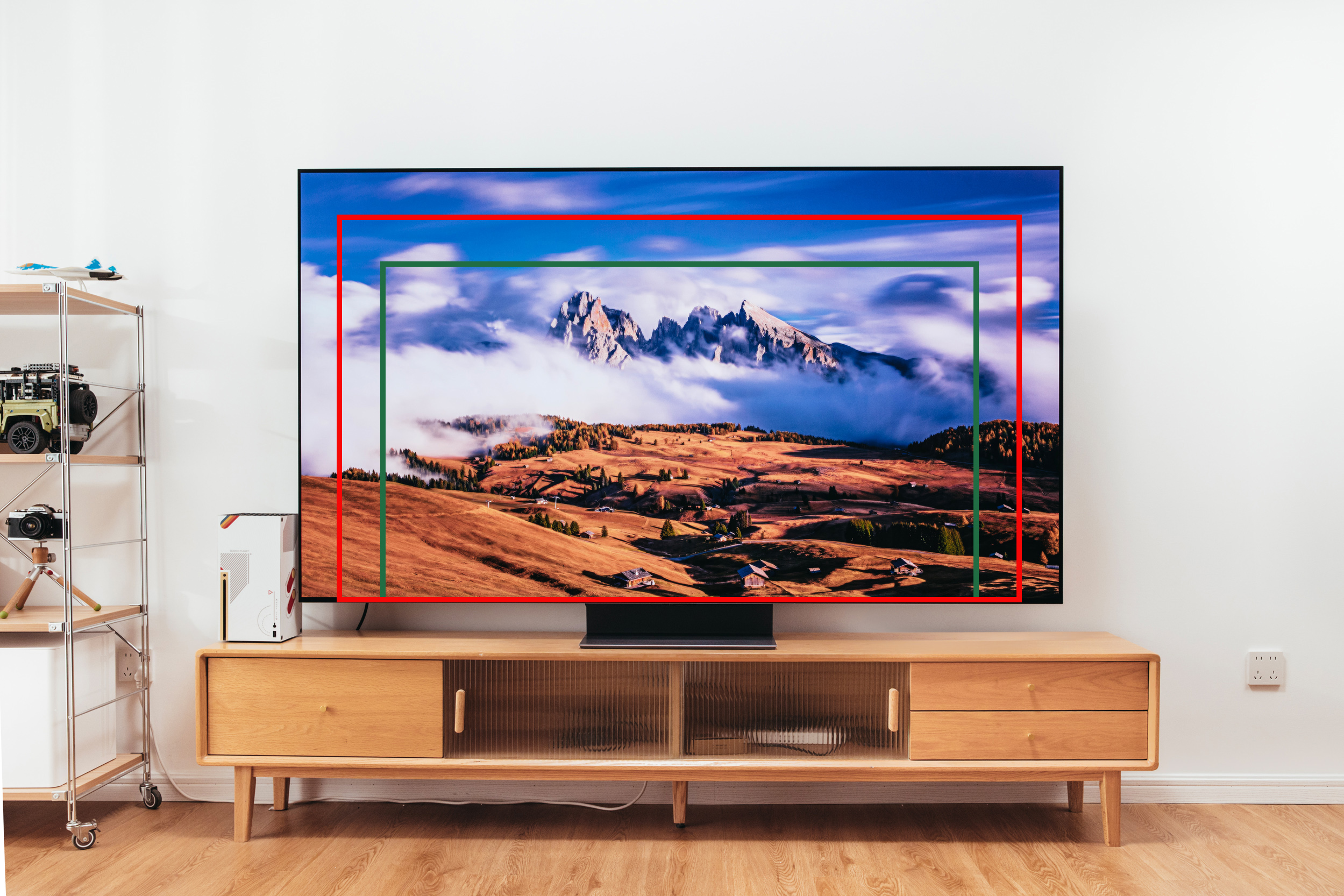 我做了一张对比图,绿圈区域为65英寸电视机屏幕大小,红圈区域为75英寸电视机屏幕大小,可以看到83和65以及75英寸尺寸大小差距蛮大的,电视机这种产品,只要你的客厅不是小客厅,电视尺寸往大了买准没错。