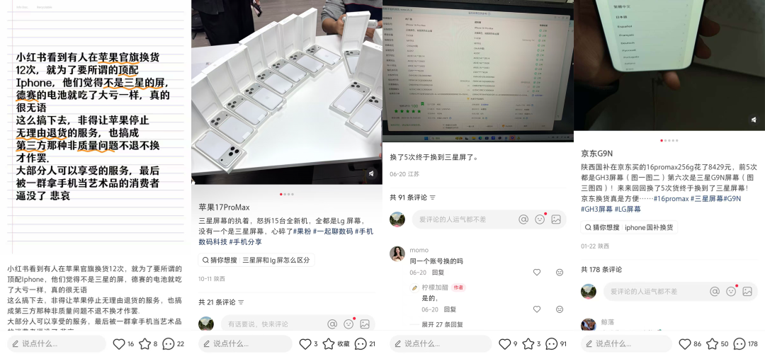 这里说的抽奖,不是那些博主“我们给大家抽一款全新 iPhone!”的抽奖,而是在小红书、贴吧等平台上,有这么一群 iPhone用户,他们利用苹果的 14 天无理由退换货政策,不断退货、换货,誓要“抽”到一台显示没有色差、没有色偏、字体通透,且必须苹果产自三星的 iPhone。