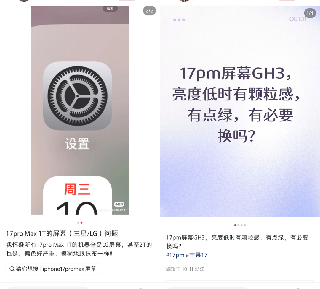 以今年 iPhone 17 Pro Max所用的 LG GVC 面板为例,在同一个批次中,就有用户拿到了观感通透、色彩纯正的“完美屏”,甚至说这才是iPhone 17 Pro Max这代的“天花板”,同时也有用户报告了虽然抽到了三星屏,但出现了轻微的黄绿偏色或“抹布感”。