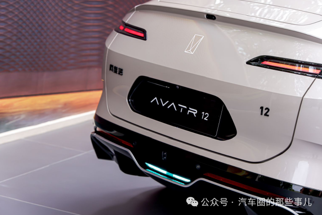 再来看车尾部分,阿维塔12四激光版的车尾设计以“星际之门”为灵感,贯穿式尾灯组内部采用LED矩阵光源,支持动态迎宾灯语。 车尾的V形后窗设计配合主动升降扰流板,优化了空气流动,降低了高速行驶时的风阻系数。 封闭式后窗与摄像头组合,为高清流媒体后视镜系统提供实时影像输出,提升了驾驶安全性。 后保险杠的扩散器造型通过空气动力学设计,减少了尾部乱流。