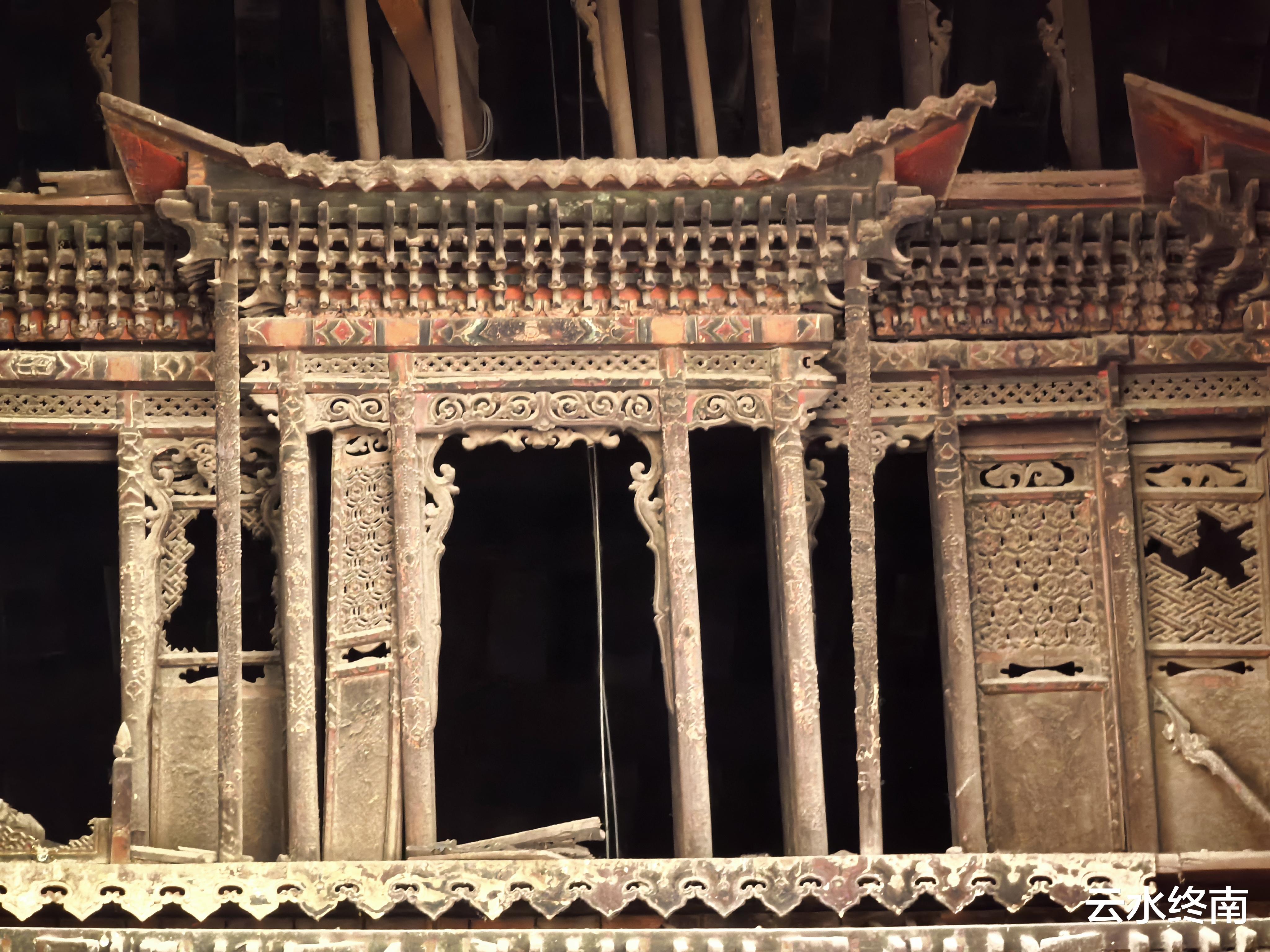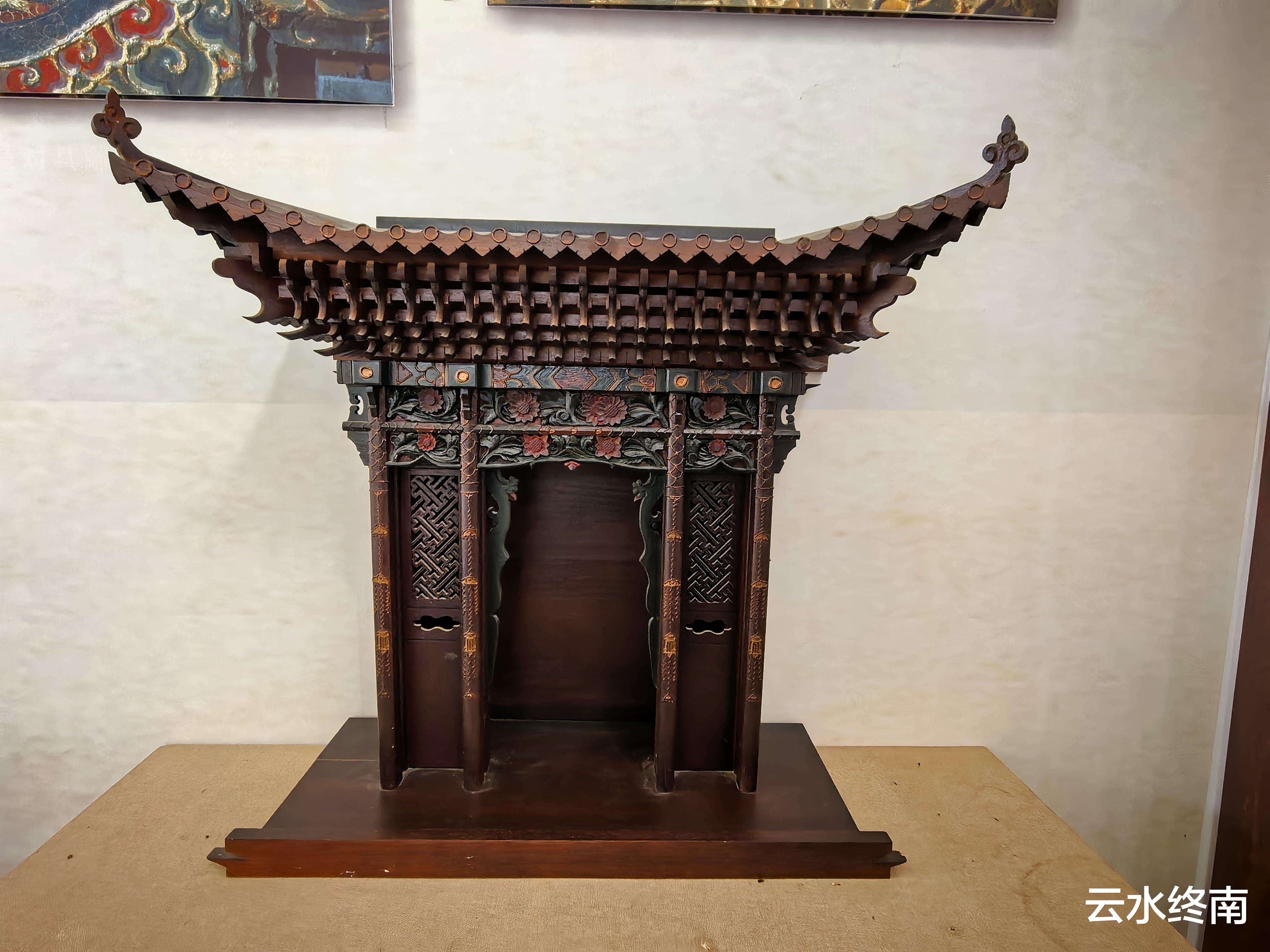 资料说这是按正常建筑比例1/30制作的,门柱斗拱飞檐梁枋和大的建筑相比,一样不少,甚至阑枋上面的雕花也是及其精微,虽然小但是一点儿也不马虎。