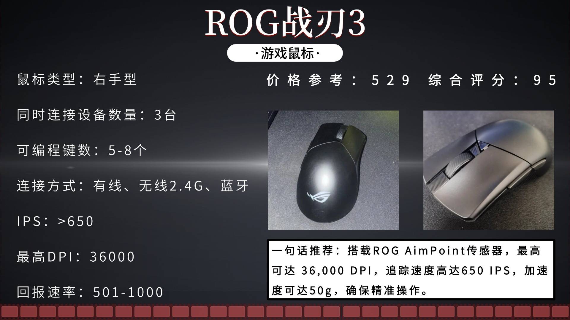 ROG 战刃3游戏鼠标是一款高性能电竞鼠标,支持2.4GHz 无线、蓝牙5.2和有线USB三模连接,搭载ROG AimPoint光学传感器,DPI范围100–36,000,可实现精准定位和快速响应。鼠标采用Push-Fit Switch Socket II可更换微动开关设计,满足不同玩家手感需求,配合符合右手握持的人体工学设计,长时间游戏依然舒适。