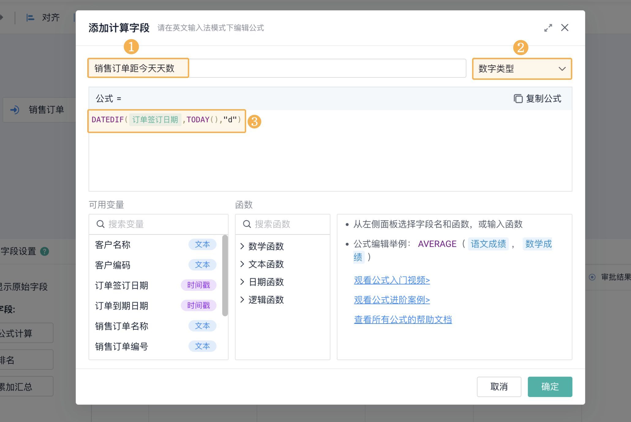 新增字段“距离今天天数”,用公式 TODAY()-订单日期