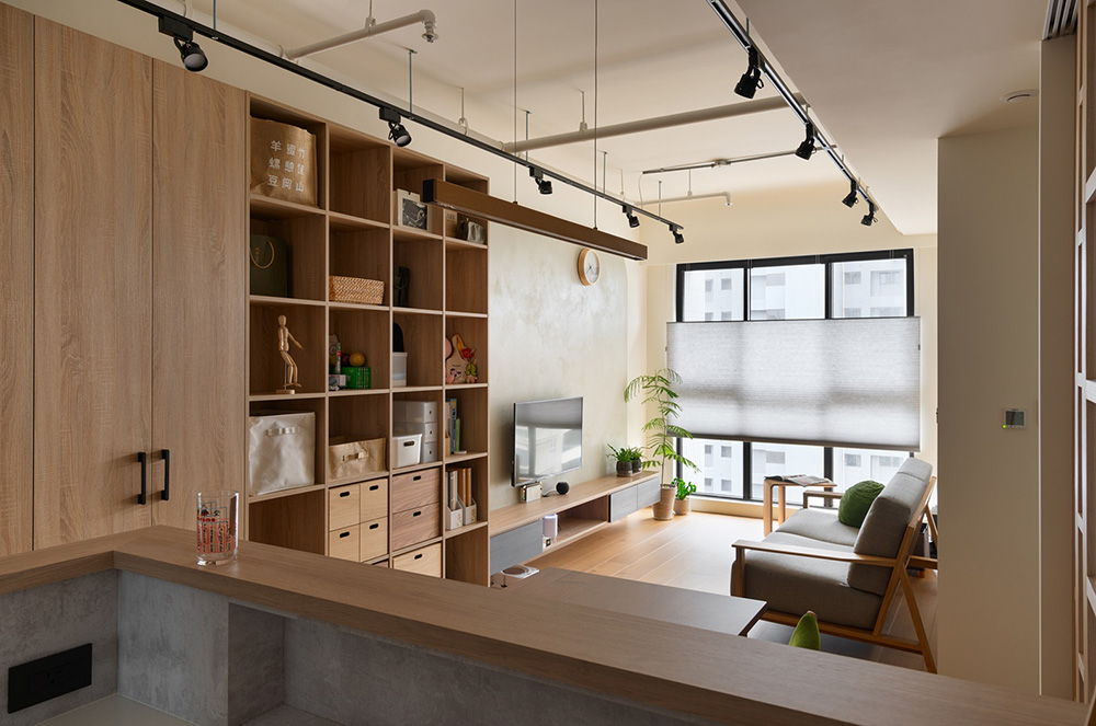 楼高优势,不仅让采光进入,更衬托了两条轨道灯,单侧高柜除了收整丰沛的收纳物,重复的方格子,使立面一展利落感,梳理了公区动线脉络,让空间保有最大自由度。