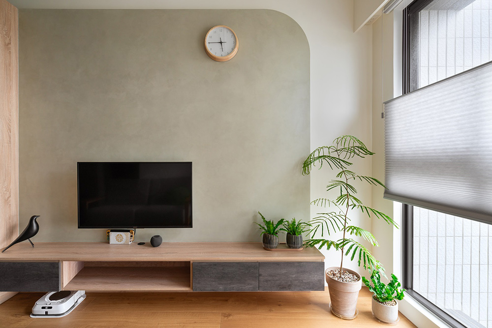 电视墙设计呼应了洞洞板,倒圆角规避了锐利感,视觉柔和许多。浅淡灰色涂料装饰电视墙与大白墙形成层次感。少许绿植的点缀,为居家增添一抹活力。