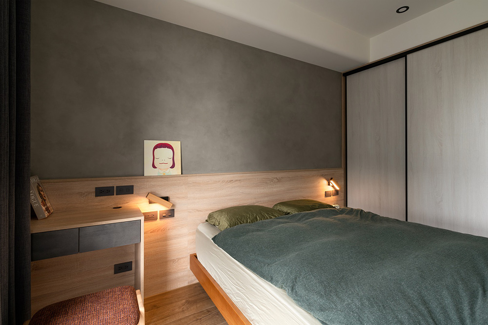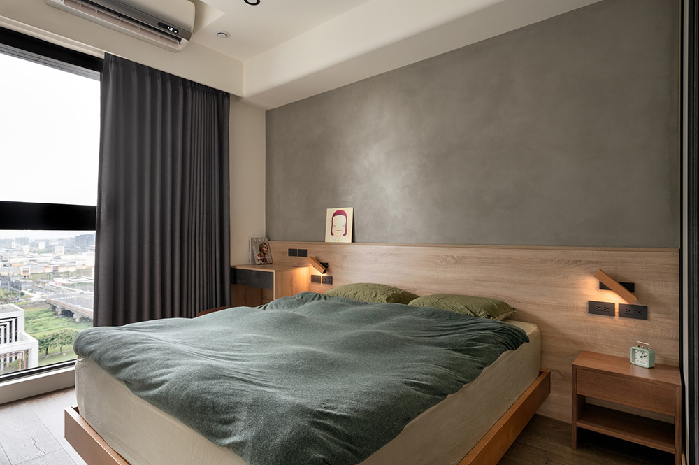卧室柔和中带静谧,宽敞的落地窗为卧室注入充足的采光和窗景。背景墙灰色涂料和原木材质结合,视觉更有层次。