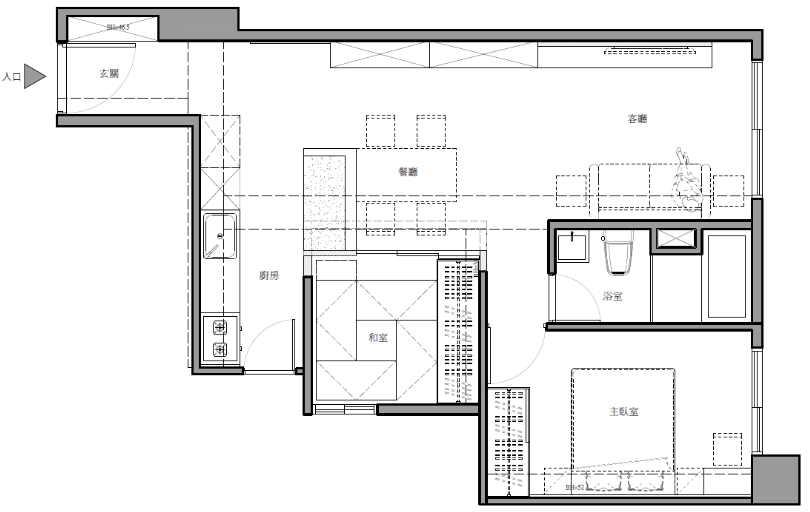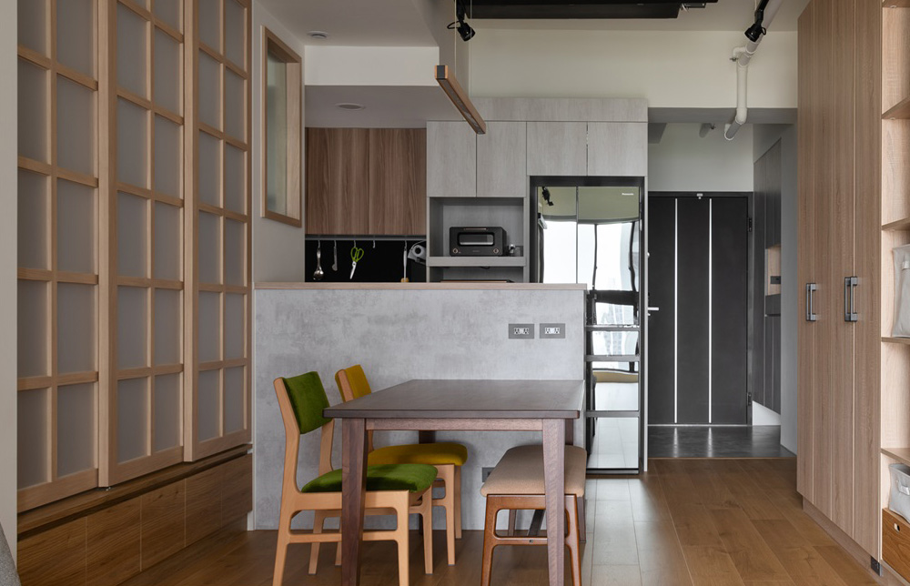 开放式餐厨设计,以90公分中岛台做分隔,面向厨房一侧做收纳,弥补厨房收纳空间的不足。中岛台以仿清水模漆涂刷,增添些许粗犷质感。
