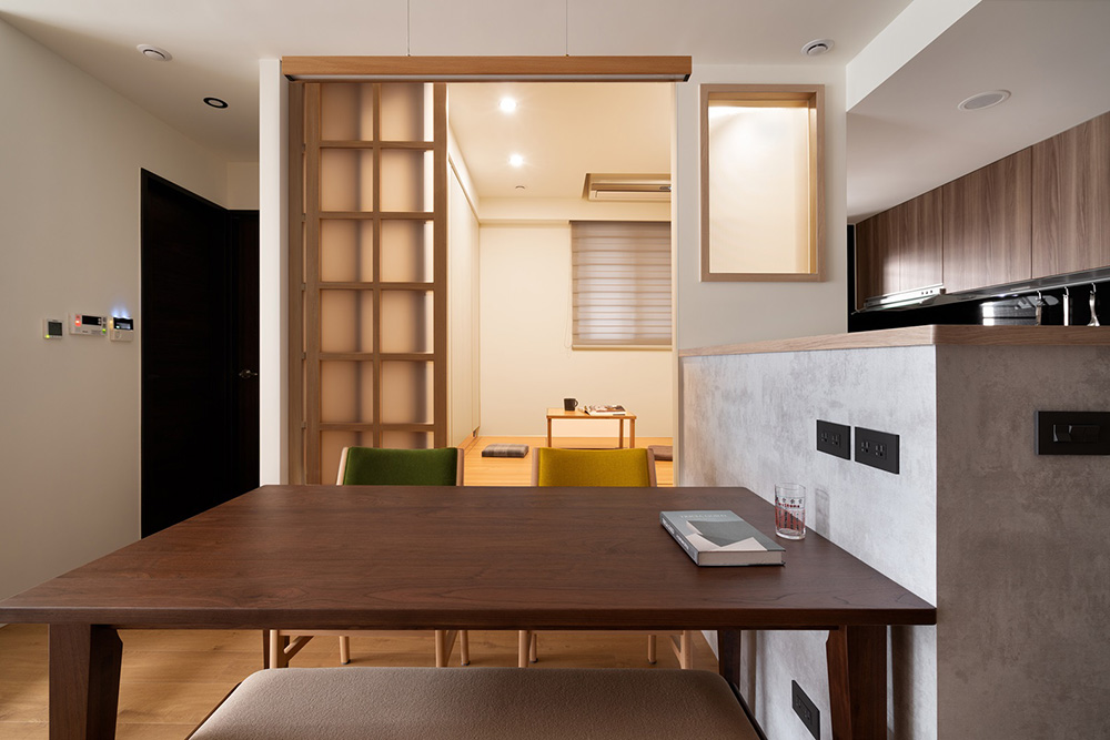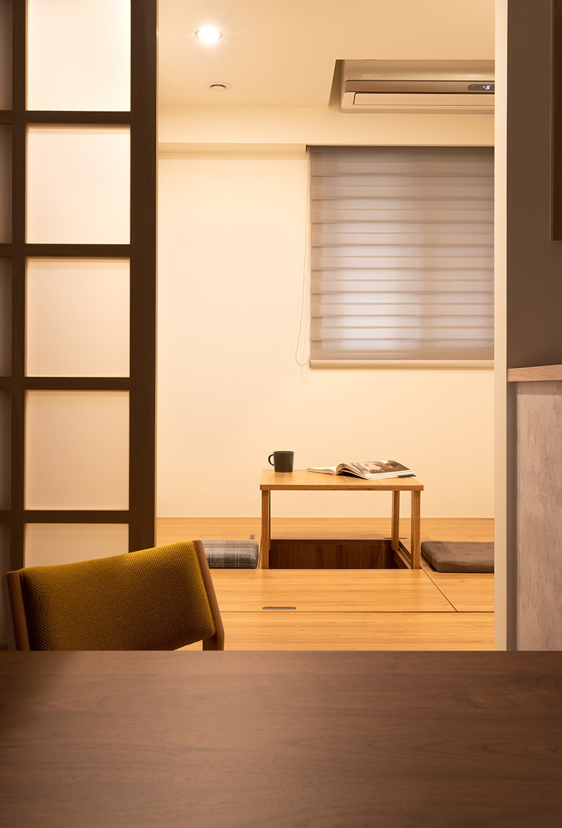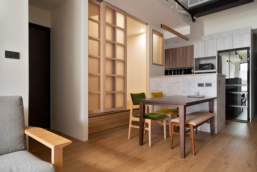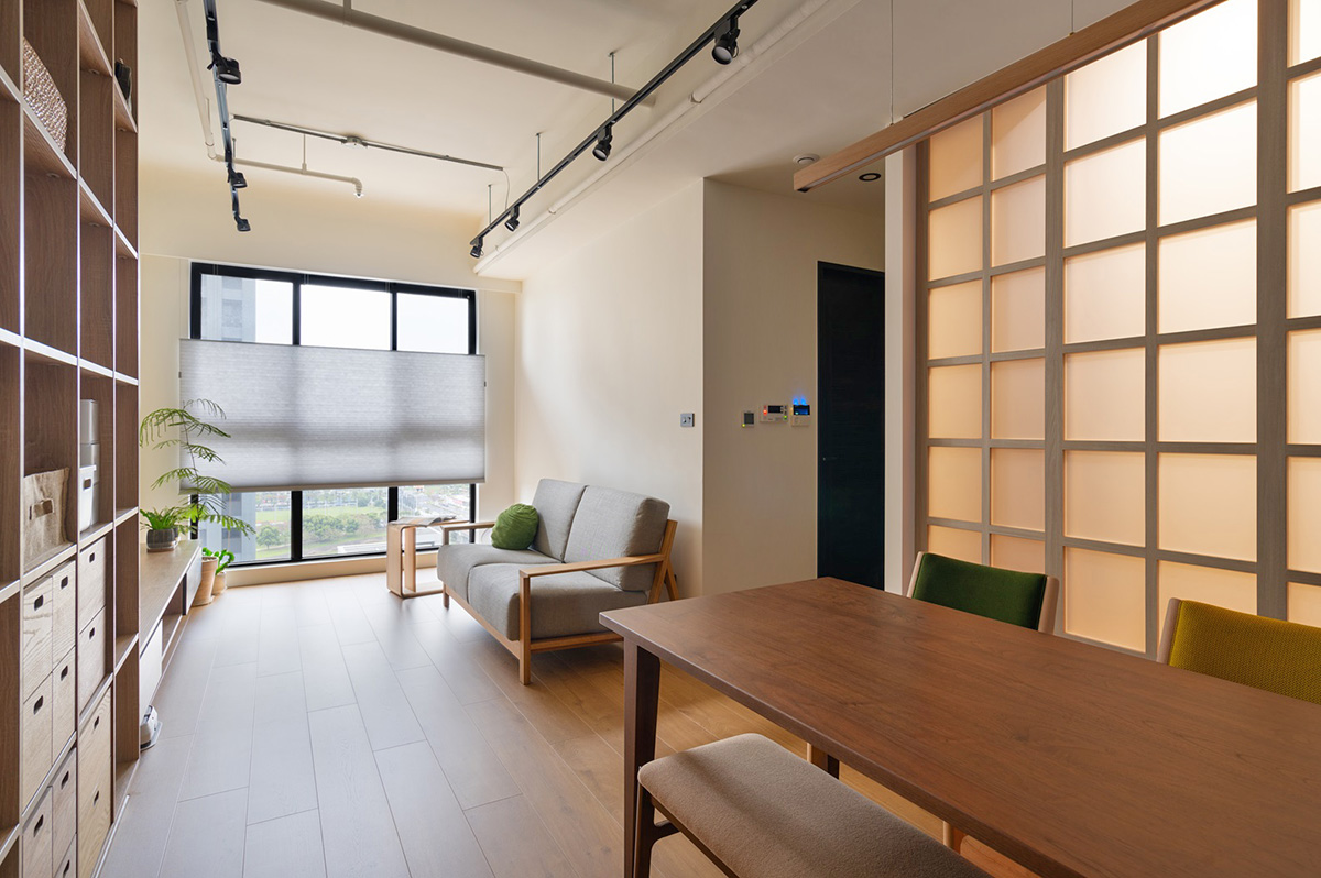 和室采用局部架高40公分的设计,既可以作为多功能室,又为居家增加不少收纳。方格滑门设计,恰如其分的视觉底调,流动着温润和风。