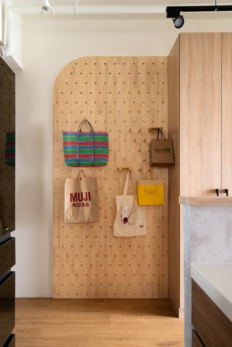 地面材质的过渡,实现入户到客厅的转变,墙面贴覆一面倒圆角洞洞板,不仅装饰了墙面,还提升了收纳。