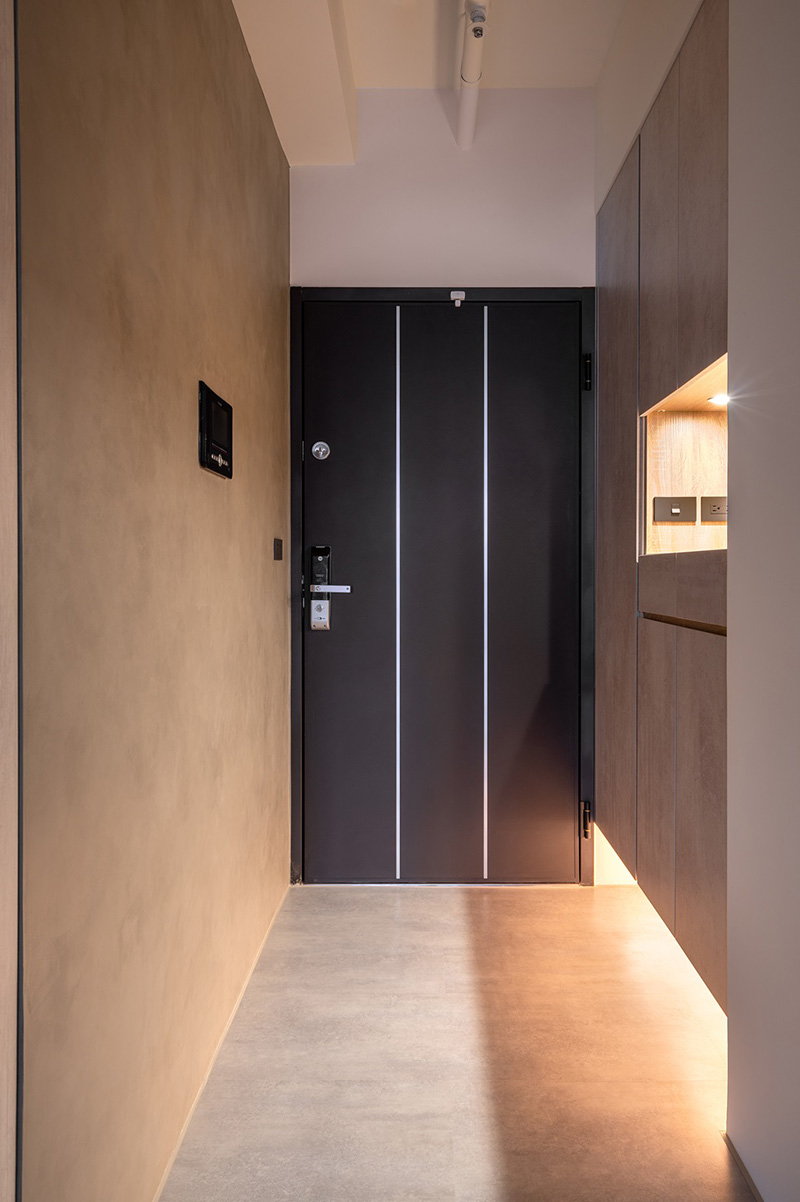 入户受原有空间限制,沿着房屋柱体以切齐的手法打造悬空鞋柜,补足空间的畸零落差。同时中间位置留有40公分的置物平台,搭配暖色光源,整体仪式感还不错。地面和墙面采用微水泥设计,冷暖交替效果挺耐看的。