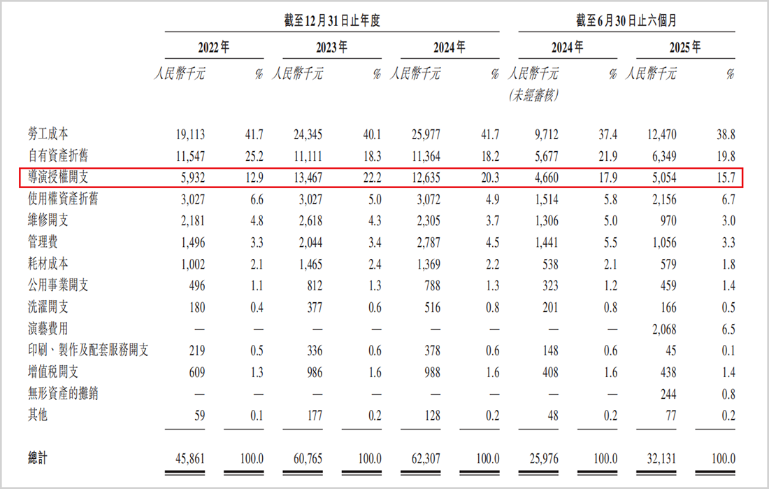 值得注意的是,2025年上半年销售成本同比增长23.69%,大幅侵蚀了毛利。其中,为庆祝新剧《月映武夷》产生的一次性演艺费用达206.8万元,即便加回此项,公司毛利率较高点仍下滑20.03%。在销售成本中,劳工成本同比增长28.40%,由租赁带来的使用权资产折旧涨幅达42.40%,这两项将成为未来持续影响成本的关键因素。
