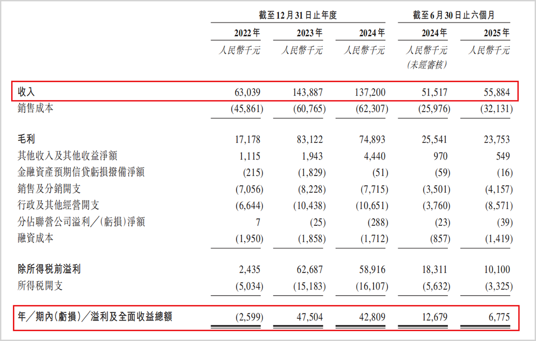 招股书显示,2022年至2025年6月底(简称:报告期),公司整体的营收分别为0.63亿元、1.44亿元、1.37亿元和0.56亿元,对应的净利润分别为-259.9万元、4750.4万元、4280.9万元和677.5万元。2023年公司录得了营收、毛利率、净利率三重最高,之后便开启下滑之势。2023年公司毛利率为57.77%,2024年为54.59%,而最新的2025年上半年仅有42.50%,较最高点下滑26.43%,资产回报率也下滑至1.6%。