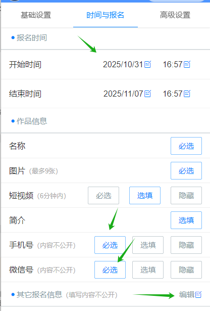活动标题、活动封面图是必填项,下一步设置好投票起止日期,灵活设置分组投票及报名设置,宿舍文化节需要参赛者自行报名的,所以就需要设置开放报名并设置报名信息(如参赛者必须填写年级,真实姓名及联系方式).