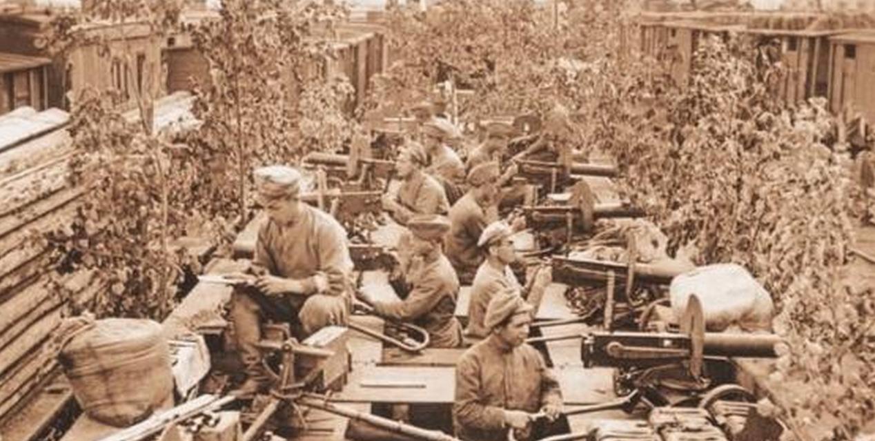 用树枝伪装的白卫军装甲列车