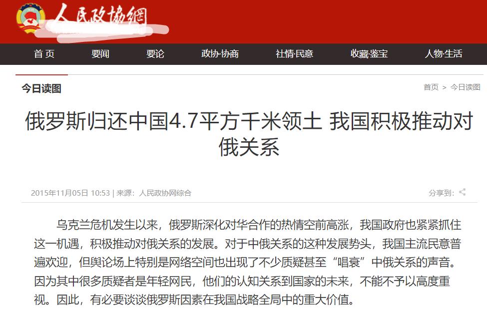 1.俄罗斯归还中国4.7平方千米领土 我国积极推动对俄关系——2015年11月05日 10:53 | 来源:人民政协网综合
