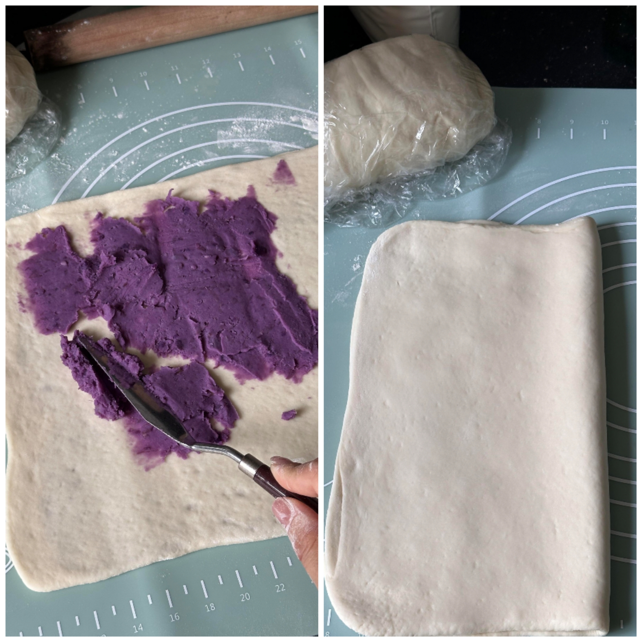 发酵好的面团取出,揉搓排气,分成小剂子。取一份小剂子,擀成薄片,中心放上适量的芋泥馅,像包包子一样收口,轻轻压扁。或者,你也可以尝试将面团与芋泥混合,擀成长条,卷起,切成小段,做成花卷,增添更多趣味。