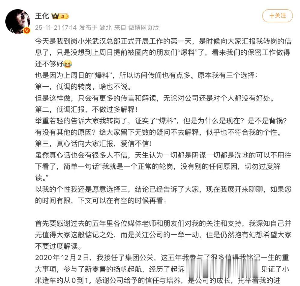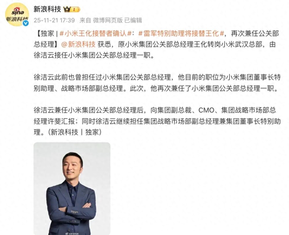 原小米集团公关部总经理王化转岗小米武汉总部,由徐洁云接任小米集团公关部总经理一职。