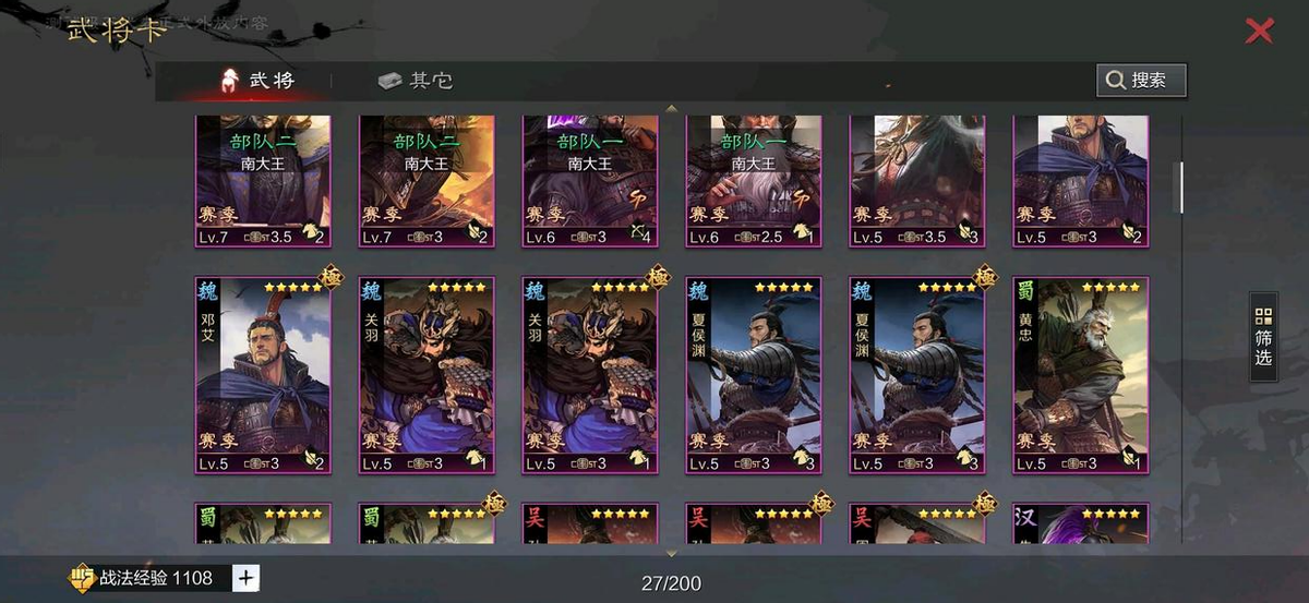 而且不光抽卡只需要用铜钱就能直接爽抽,卡包里还只有五星武将,玩家无论怎么抽都是五星,什么废卡、菜鸡卡统统没有。就看这一仓库的五星,放在普通SLG里平民玩家全靠爆肝他玩得起吗。