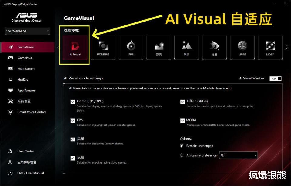 当然如果你嫌来回切换麻烦,其也提供了AI Visual 自动适应程序。该功能可以实时对屏幕场景进行分析,然后根据画面内容自动调整最适合当前内容的屏幕设置。