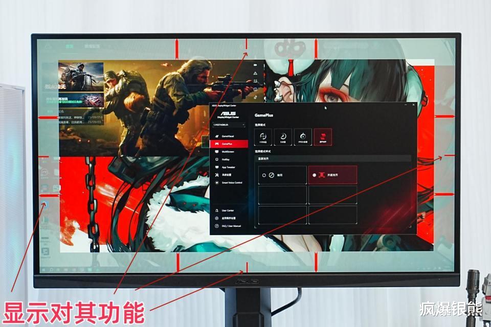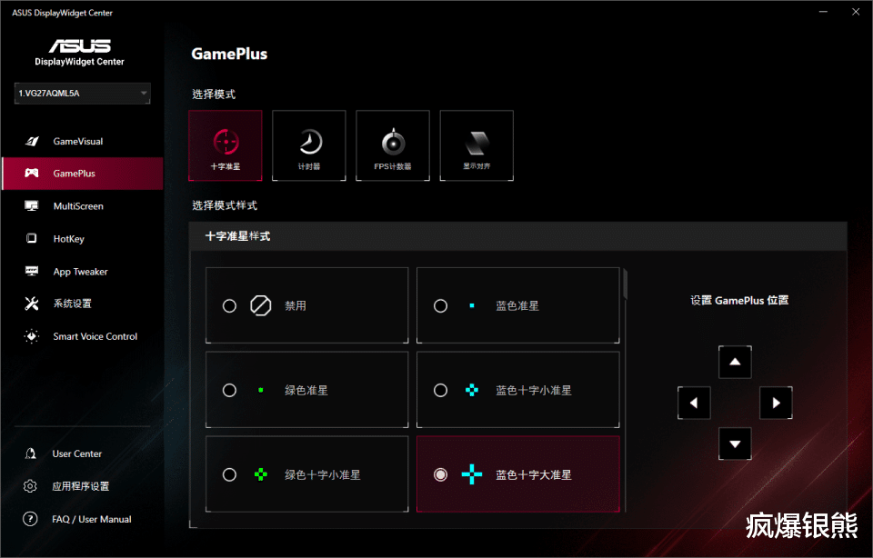 GamePlus辅助功能(GameMing AI 技术)内置了很多好用的“物理外挂”级的功能。以十字瞄准线为例,别家只有几个不同样式的供选择,华硕这个准星是动态可变化的,即准星颜色可根据游戏画面颜色自动调整成对比更加突出的颜色,让玩家更清晰的瞄准到对手。