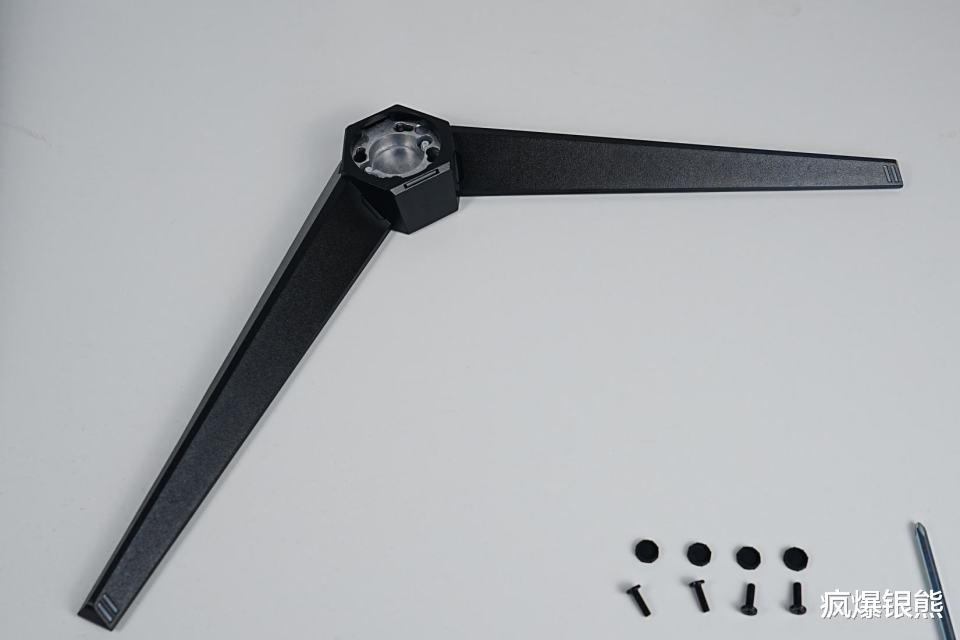 配件上,除了回旋镖腿架和长条形支架外,还有一根DP1.4数据线及电源线一根,说明书保修卡各一本,固定螺丝若干,内置电源适配器设计必须好评。