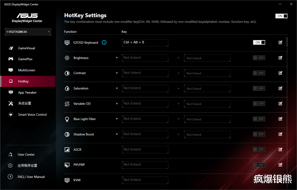 DisplayWidget Center中,其也集成了热键功能,通过热键我们可以把常用的 显示器设置 自定义一个键盘快捷键,方便我们随时调整显示器设置,例如系统帮我们定义好的Ctrl+Alt+0是自动打开OSD菜单。