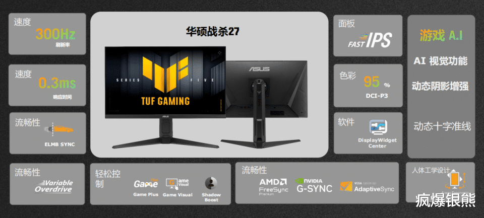 2K分辨率(2560×1440)、300Hz刷新率、0.3ms急速响应、支持G-SYNC、FreeSync与ELMB-Sync且获得HDR400认证,并配备了华硕AI游戏技术,实现了防撕裂、低延迟与动态清晰三重同步,游戏体验一级棒。