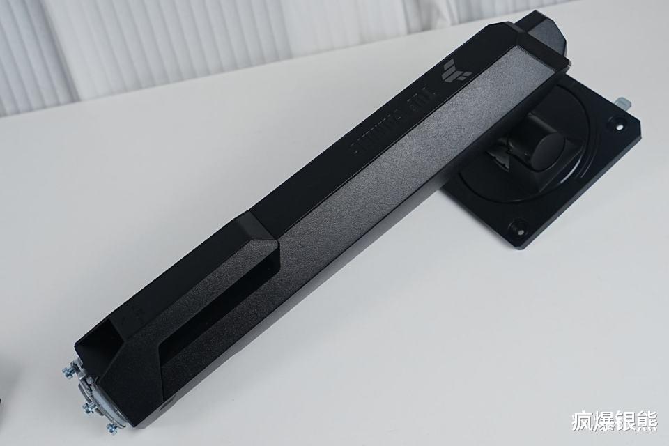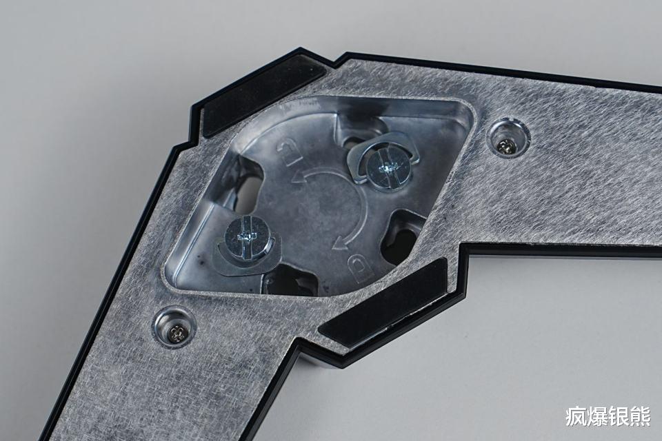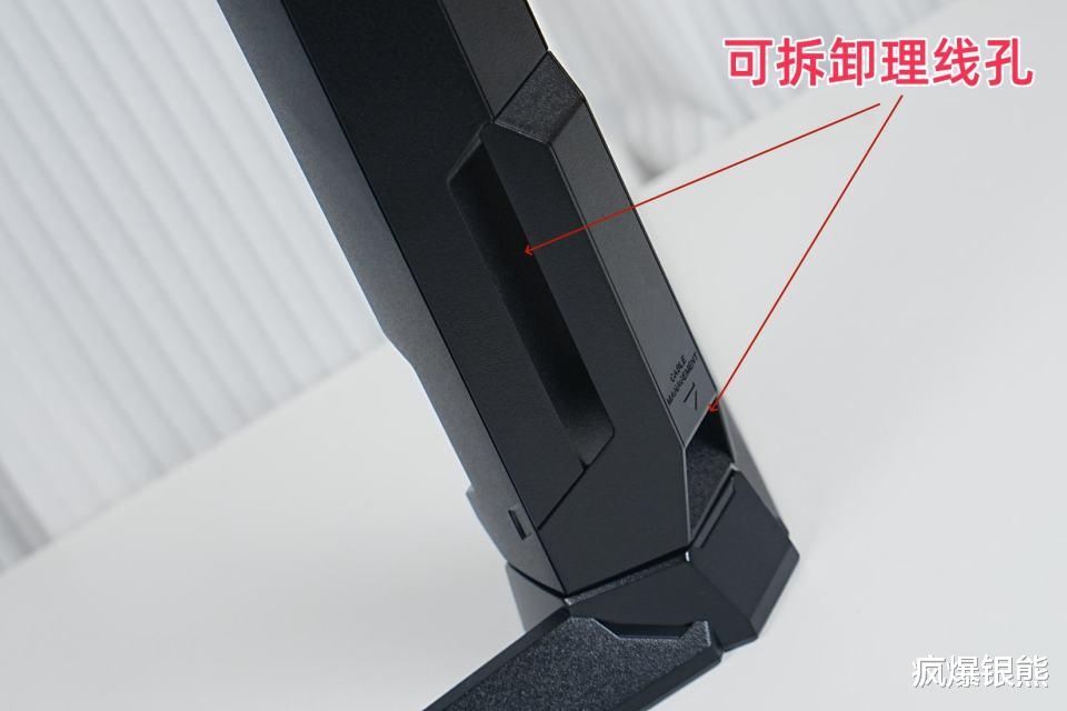 支架也是黑色的塑料饰板,中间设计了TUF的LOGO及TUF GAMING字样,底部的理线孔支持拆卸,方便用户梳理线路。