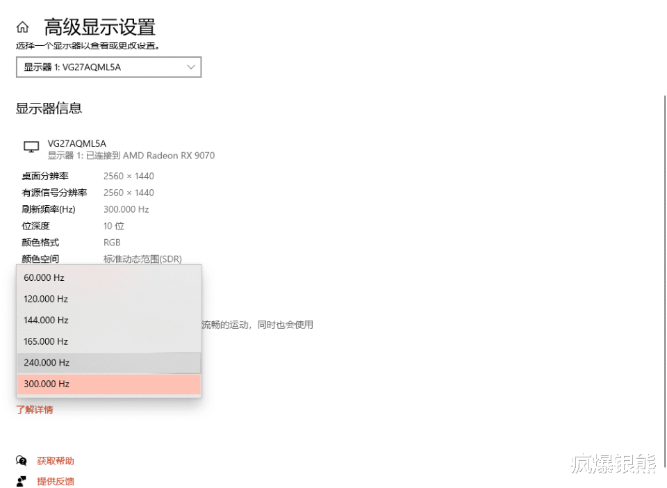 想要实现2K分辨率300Hz的刷新,需要我们的PC电脑拥有HDMI2.1或DP1.4接口的带宽才够,这点需特别注意,如果在PC设置上你调不出300Hz高刷只有两种可能,电脑接口不行,或者线不是原装的。当然如果你觉得300Hz日常用不到,在设置界面我们还可以选择240、165、144、120、60等刷新率。