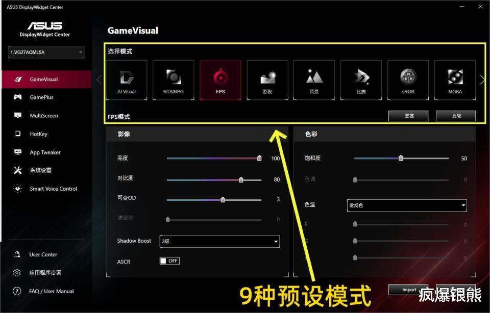 除了以上辅助功能外,其还针对不同游戏玩家提供了诸如FPS模式、RTS/RPG模式、MOBA模式、赛车模式、电影模式、场景模式、夜视模式及用户自定义等9种预设模式。每种模式都针对特定画面内容进行色彩、对比度与锐度的精细调校,例如 FPS 模式强化暗部细节、影院模式优化色彩层次、MOBA 模式提升敌我单位辨识度等。