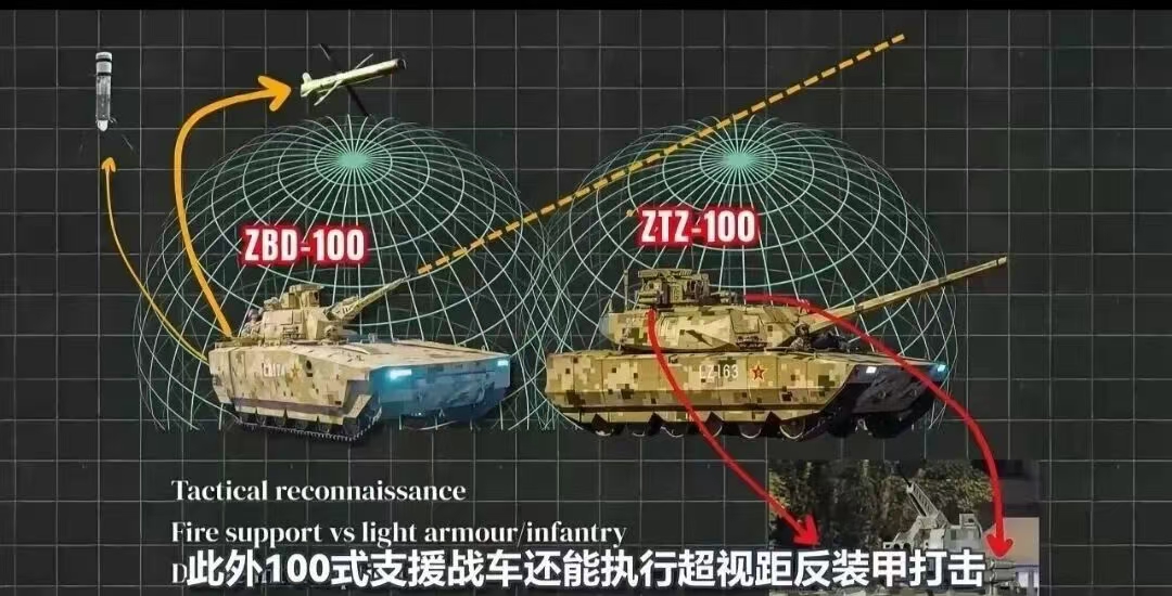 100式中型坦克,它不是一辆车在战斗,而是与100式(ZBD-100)火力支援车混编作战的,将两辆战车组合到一个系统中,不仅可以确保持续的数据交换,还可以确保相互火力支援,体现了中国人民解放军陆军开阔的眼界和超前的战略视野。