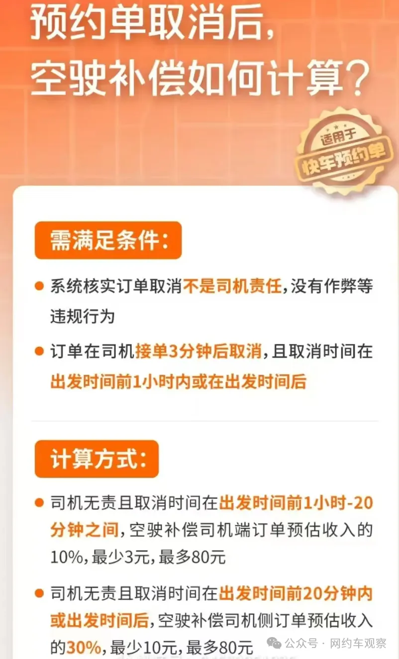 司机无责且取消时间在出发时间前20分钟内,或出发时间后,空驶补偿按照司机端订单预估金额的30%,最少补偿10元,最多补偿80元。