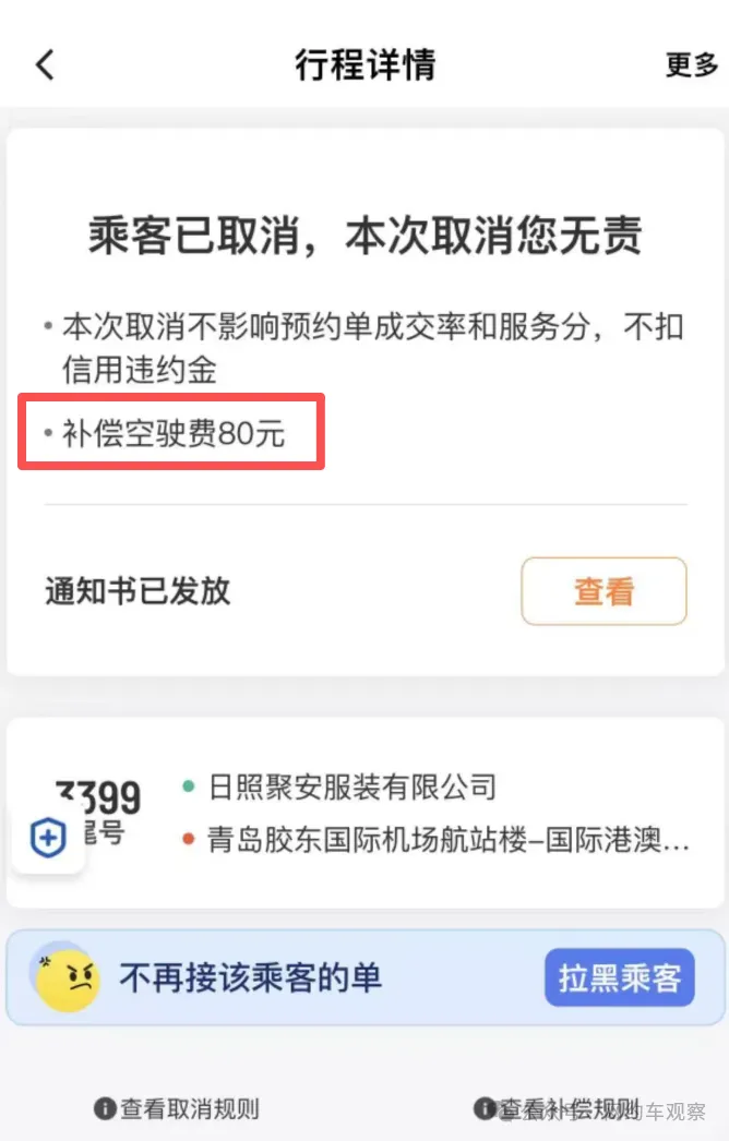 例如,这名山东日照的师傅接到了一笔去青岛胶东机场的订单,被乘客取消后拿到了平台的80元空驶补偿。