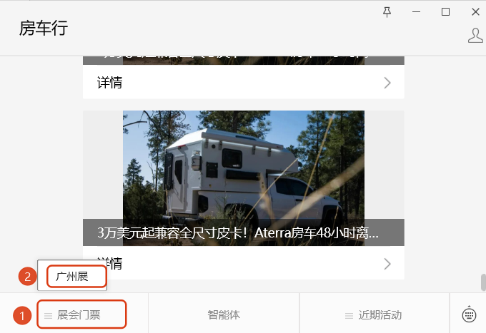 关注“房车行”、“路程网”、“房车展RVSHOW”任一微信公众号,点击“展会门票”,点击“广州展”,填写个人信息,即可获得免费门票。