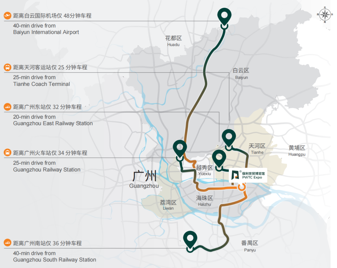 距【广州白云国际机场】45公里,乘坐出租车约48分钟,地铁约65分钟