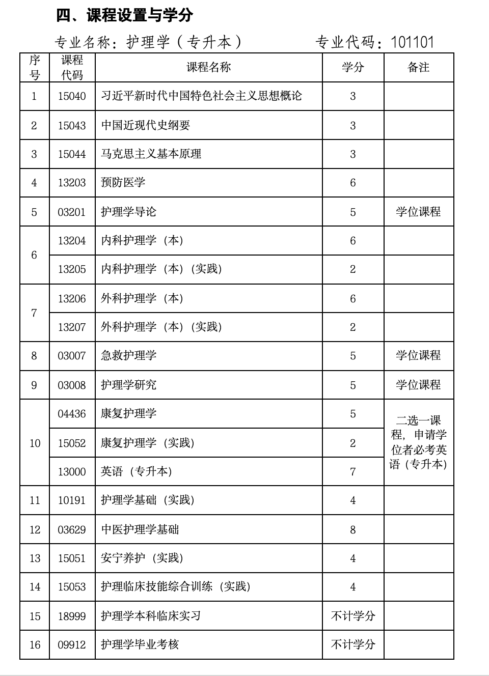 4. 专业实践课程:内科护理学、外科护理学、康复护理学、护理学基础、中医护理学基础、安宁养护、护理临床技能综合训练、护理学本科临床实习、毕业论文等。