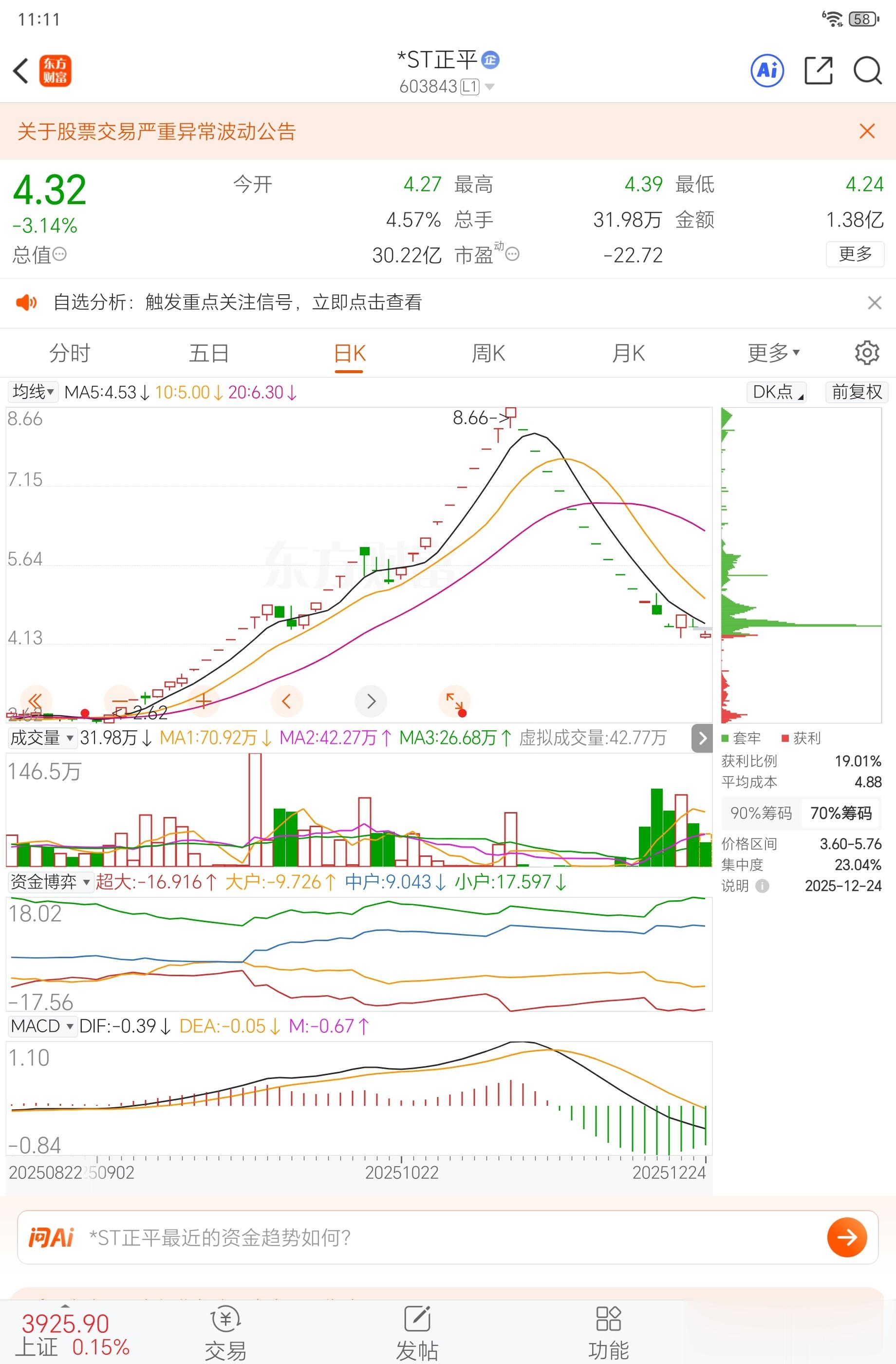 还有ST正平,我5块多买的,一路涨到8块多,赚了有五六十个点,结果毫无征兆就开始一字板下跌,跌到4块多,利润亏光不算,本金也亏了一大截。