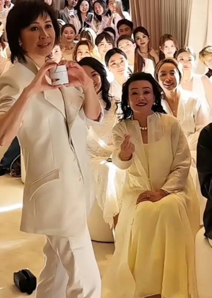 这次活动,是刘嘉玲的主场。她穿一身白色西服套装强势干练,反倒是平时总以“女强人”风格示人的张兰,穿了白色刺绣连衣裙,气质更加温婉。
