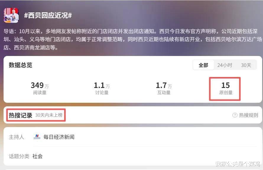 传播数据也佐证了这一点。在微博上,媒体等意见领袖针对这一话题发起的词条有“西贝近况”、“西贝回应近况”、“西贝回应门店调整”,这些词条本身就缺乏话题性。