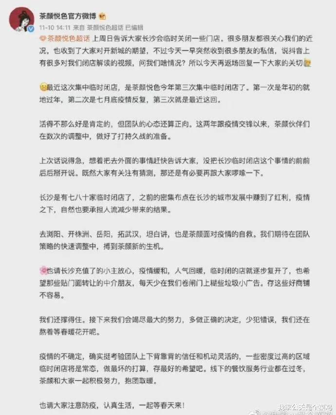 最后,菜鸡公关想分享两家企业的类似案例,分别是钱大妈和茶颜悦色。这两份闭店声明比西贝好的点在于,一是前面提到的人味,他们更愿意坦诚分享创业路上遇到的困难,而不是一味的嘴硬;另一方面是更加主动,比如茶颜悦色的回应甚至比传言来得还要快一些。