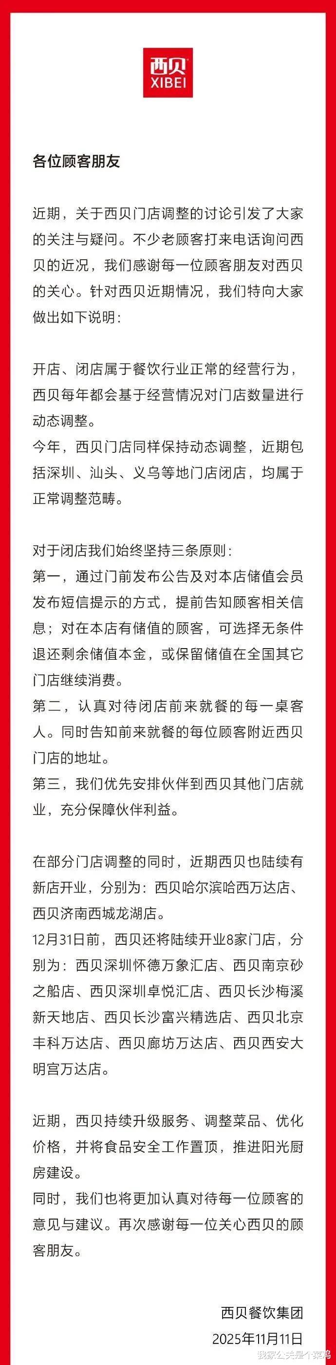 2.闭店潮传言:西贝正常的经营行为,每年定期会对门店进行动态调整;