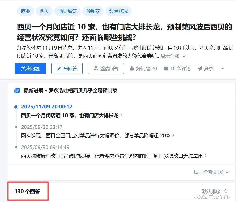 在知乎上,此前关于西贝闭店传言的提问有130个回答,但关于西贝回应闭店的话题,甚至都没有一个相关问题被提出。