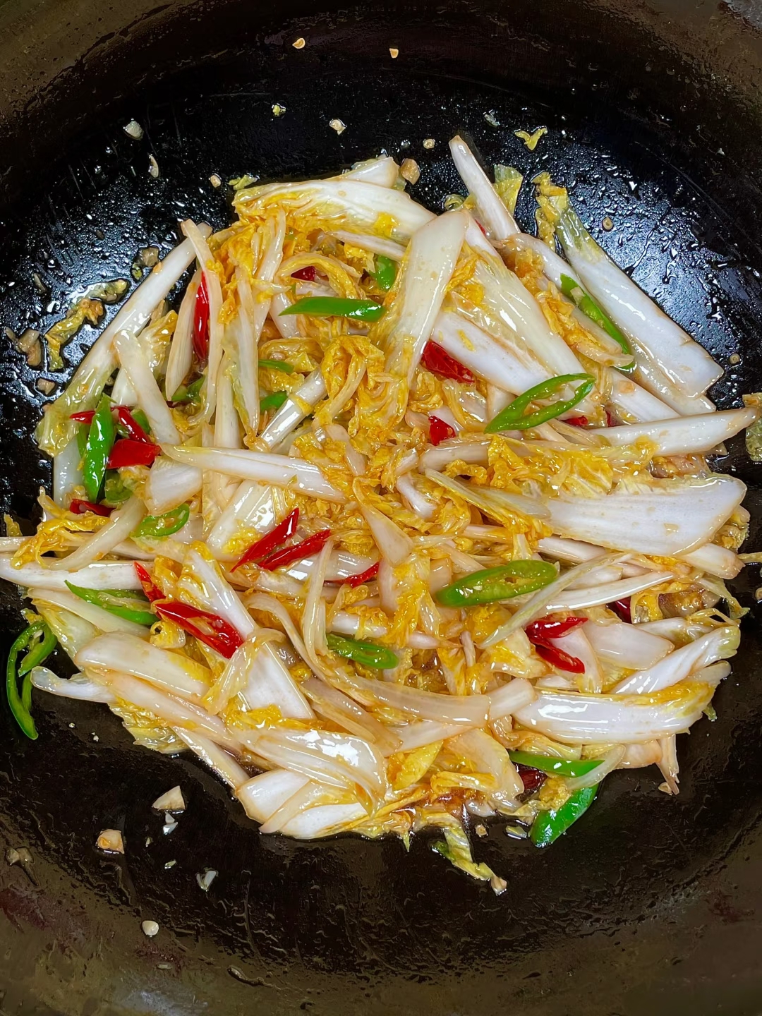 将娃娃菜对半切开,斜刀切成1厘米宽的细条。重点来了!把菜帮和菜叶分开摆放——菜帮需要多炒1分钟,混在一起会导致叶子过软。切好的白菜撒半勺盐抓匀,5分钟后挤掉多余水分,这一步能让白菜保持脆爽的秘密武器。偷偷告诉你们,挤出来的菜汁别倒,留着煮面超鲜美!