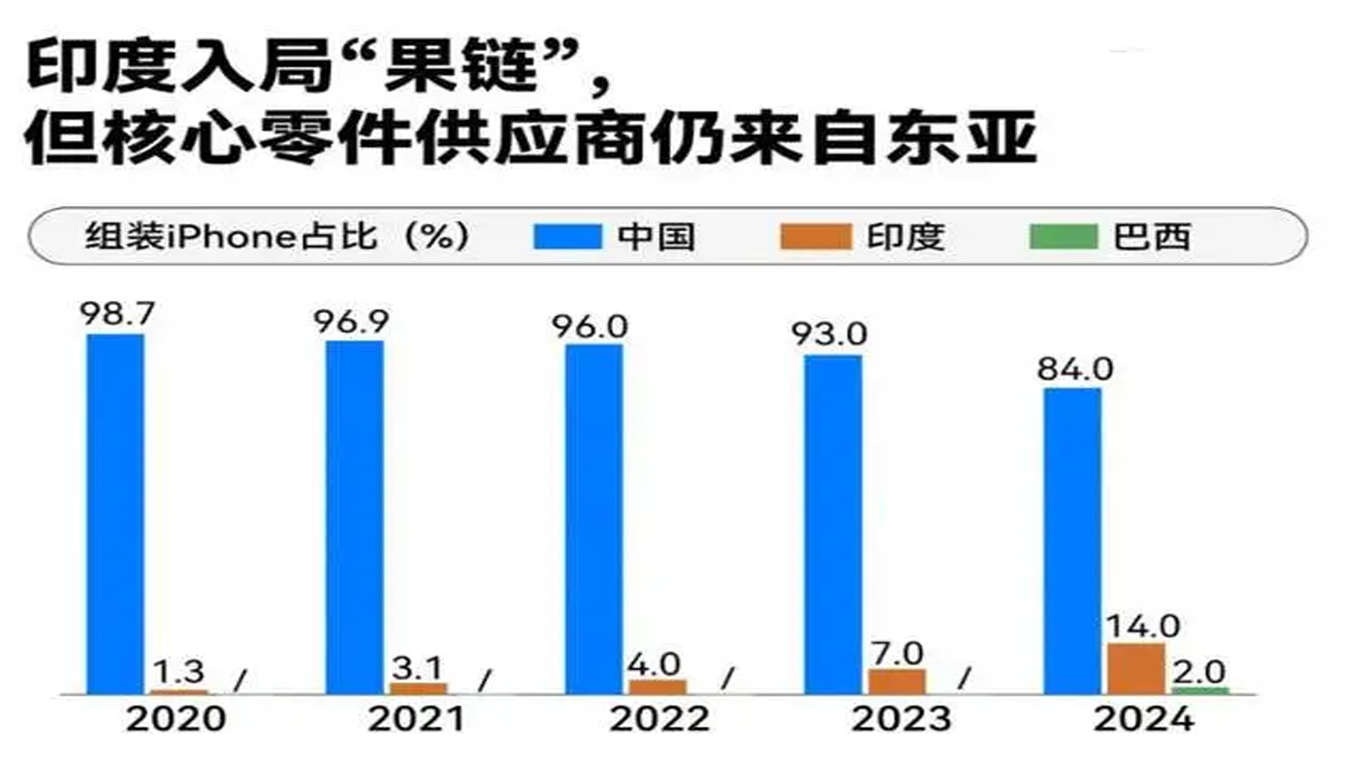 尽管印方强制要求iPhone零部件30%本土采购,但现实是除充电线、包装盒等低价值配件外,屏幕模组、电池芯、摄像头传感器等核心元件仍需从中国进口。印度工厂更像一个大型“组装车间”,其价值创造仅停留在最终装配环节。