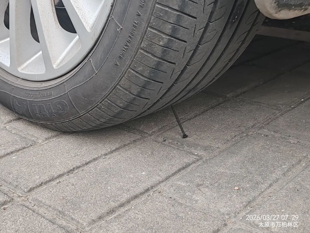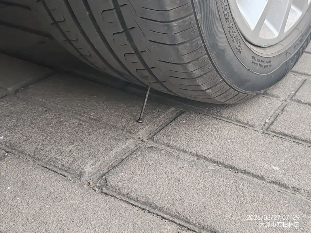 商户除了打电话还用实际行动威胁车主,在车的后轮轮胎前后都放了钉子
