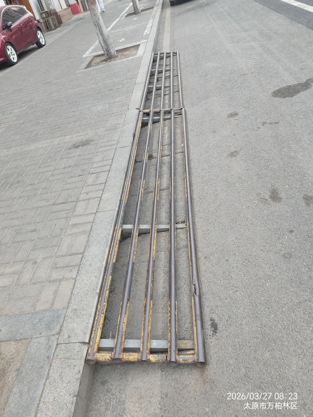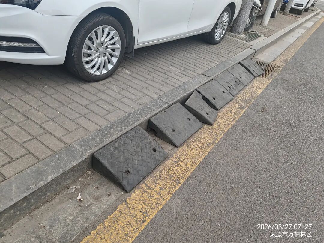 以上是商户门前的公共停车位,路边马上牙子上安装的台阶垫,像这种情况在商铺门前比较常见,有铁管焊的,有水泥做的。